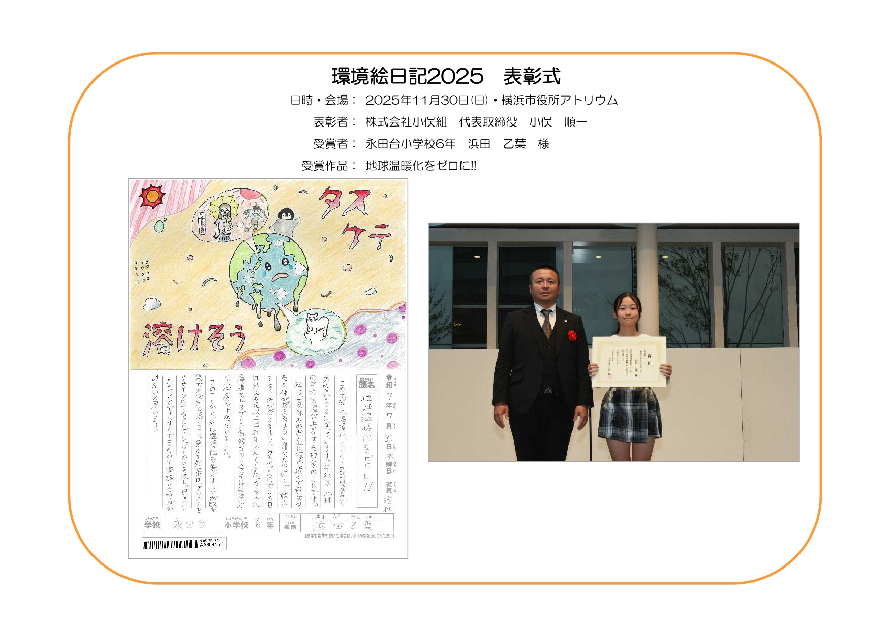 「家族や身近な人たちと考える環境未来都市」をテーマとした「環境絵日記」に当社が協賛し、横浜市役所にて地元企業賞の表彰をしました。